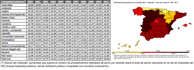 En España desde el 2004 al 2012 las tasas de cesáreas permanecen constantes, alrededor del 25%. Existiendo diferencias significativas entre diferentes comunidades autónomas, donde destacan las cifras ajustadas del País Vasco, Navarra y Asturias con porcentajes del 12,64%, 15,98% y 16,98% respectivamente (INE 2011), por el contrario las tasas más elevadas se centran en Extremadura, Castilla y León y la Comunidad Valenciana con un 27,49%, 25,46% y 24,51% respectivamente. Por otro lado, la OMS señala como cifras adecuadas las que se sitúan entre el 10 y el 15%. En el gráfico inferior tienes los porcentajes pormenorizados (tomado de ‘Evolución de la tasa de cesáreas en los Hospitales Generales del Sistema Nacional de Salud, años 2001-2011’).