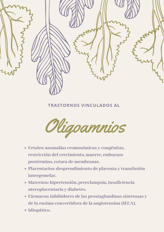 Es indiscutible que varios son los factores vinculados al oligoamnios: fetales (anomalías cromosómicas y congénitas, restricción del crecimiento, embarazo postérmino, etc.), placentarios (desprendimiento prematuro de placenta y transfusión intergemelar), maternos (diabetes, hipertensión, insuficiencia uteroplacentaria, preeclampsia, etc.), fármacos y de naturaleza idiopática.