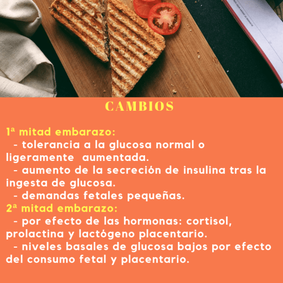 La glucosa materna se considera la principal fuente energética fetal, de forma que los cambios producidos en la gestante pretenden que la glucosa esté en niveles aceptables y en cantidad suficiente para que el feto satisfaga sus necesidades. Y para ello se producen una serie de cambios desde el punto de vista bioquímico, como es una tendencia a la hipoglicemia y aumento de cuerpos cetónicos en ayunas, aumento de triglicéridos y colesterol, además de incrementarse la insulina posprandial.