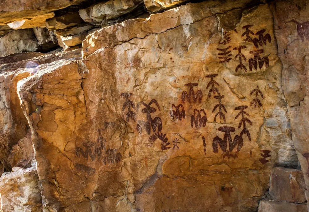 «Panel de las paridoras, con figuras femeninas que aparecen agachadas, con las piernas flexionadas y abiertas y bajo una de ellas se observa otra pintura que podría interpretarse como la descendencia. Abrigo de Peña Escrita en Fuencaliente (Ciudad Real) Foto: Cultura Castilla-La Mancha (Sacado de OK diario)«.