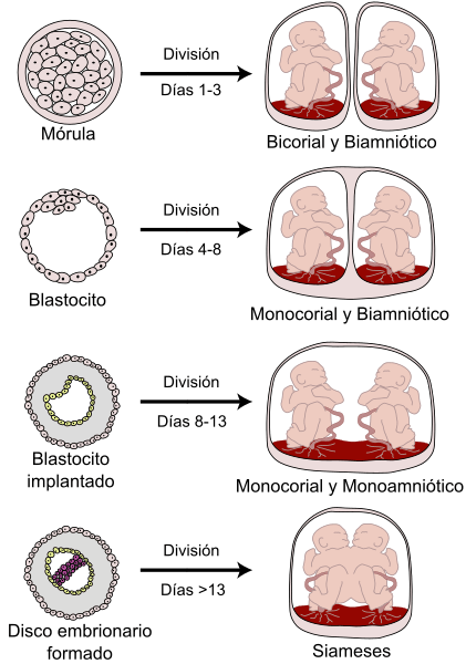 Quizás sea interesante señalar que dependiendo del momento de la división del óvulo provocará diferencias respecto, y principalmente, a la corionicidad (placenta):